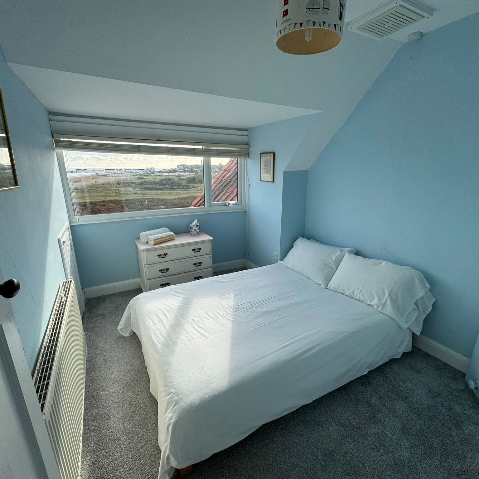 Bedroom 3 (double bed) has fabulous dual aspect views over the sea and onto the beach below, plus a TV.